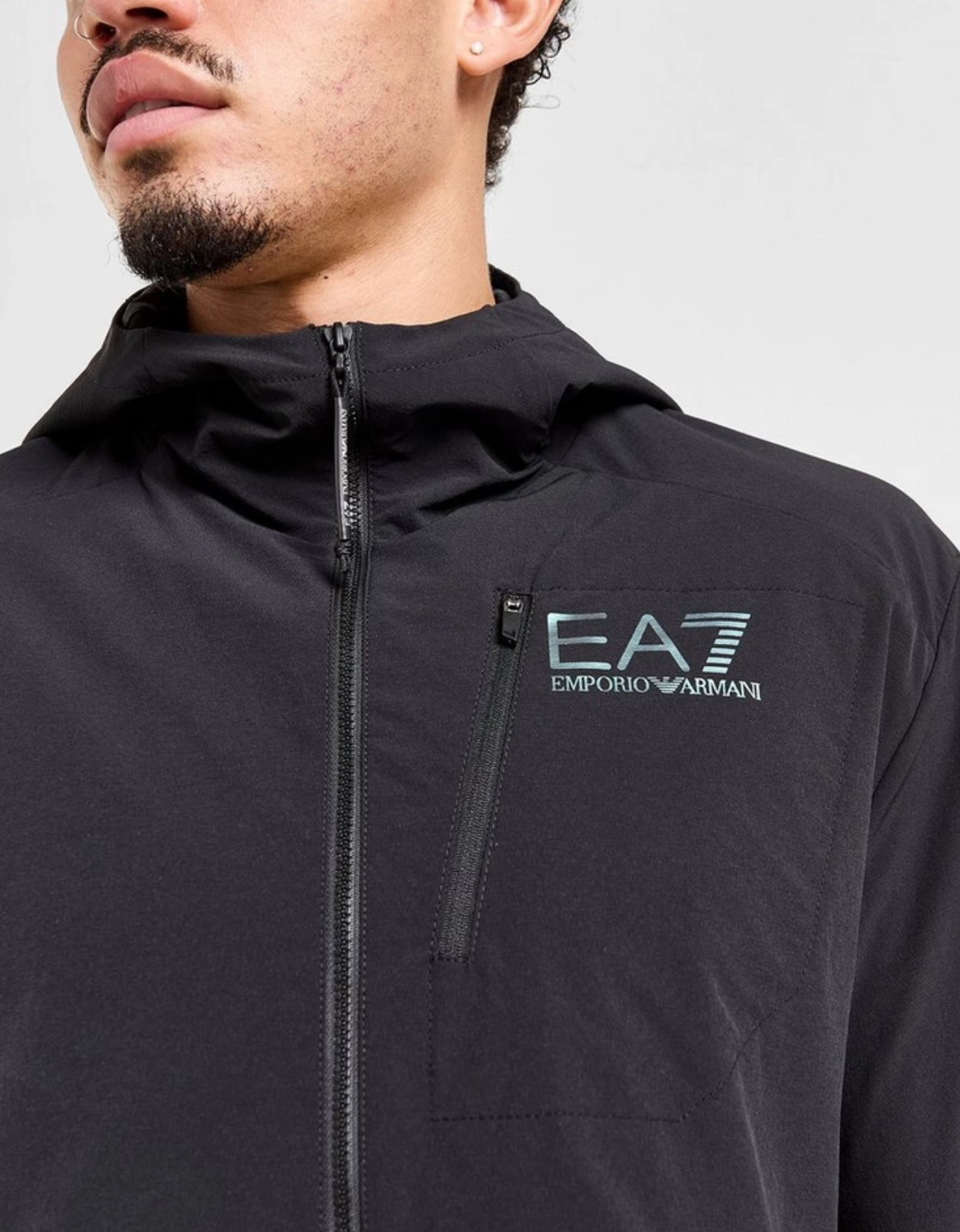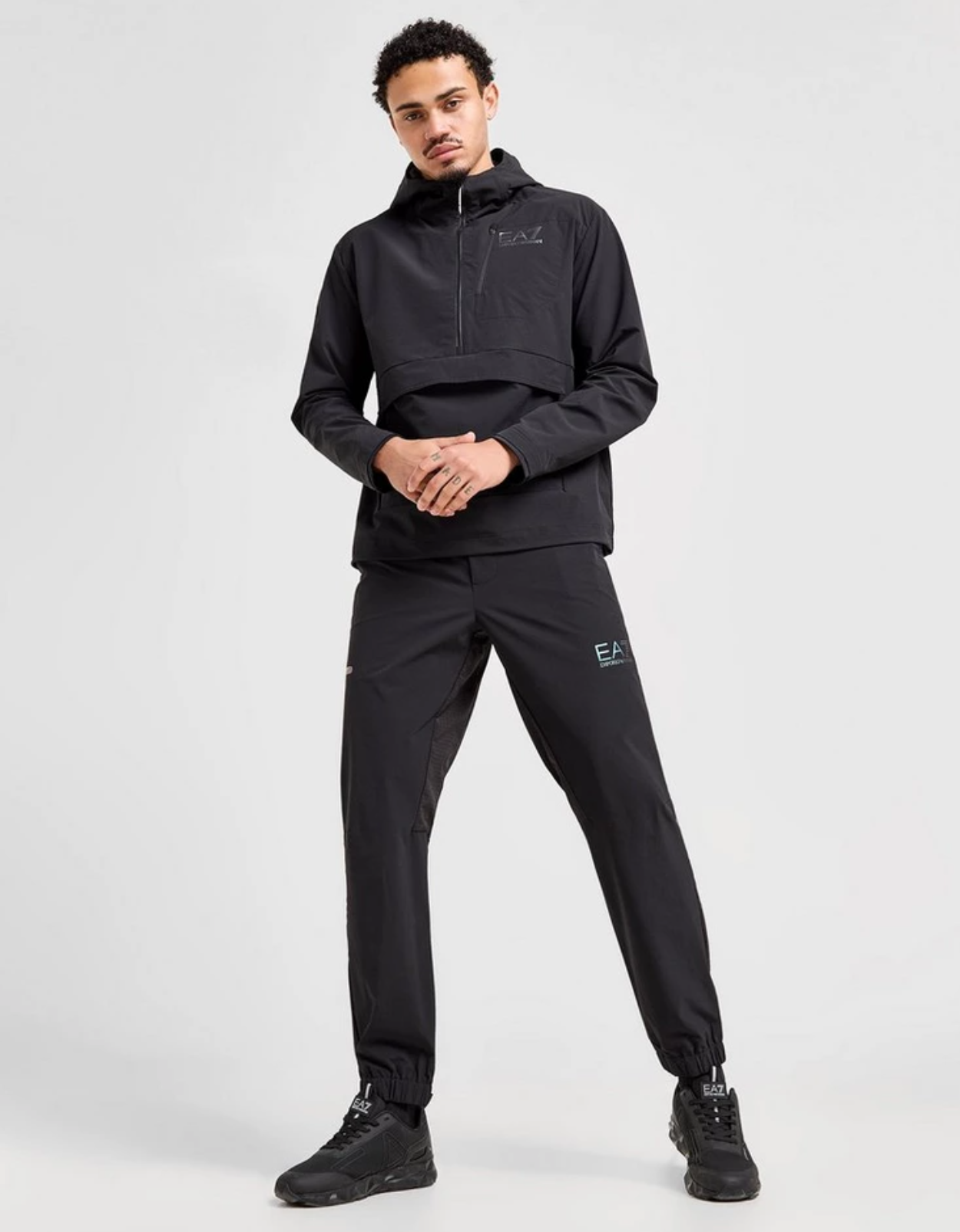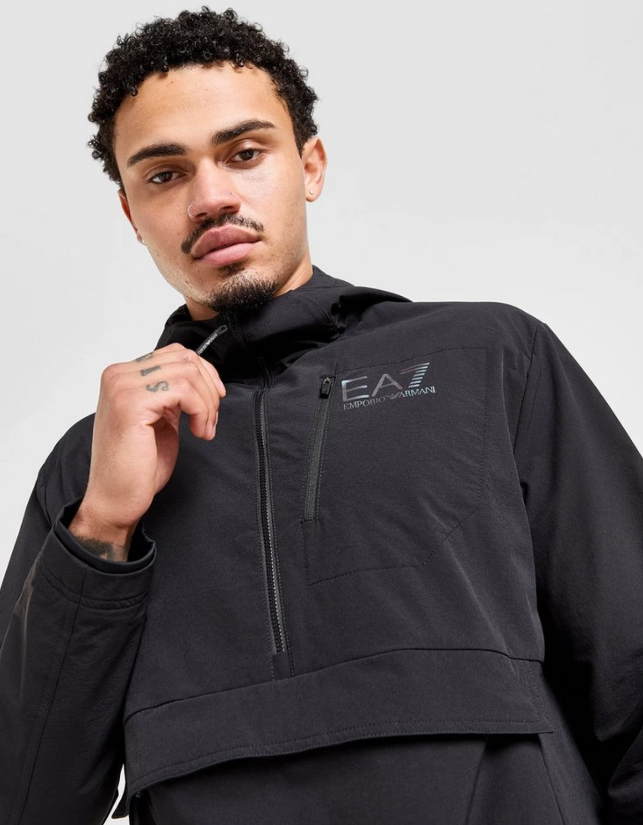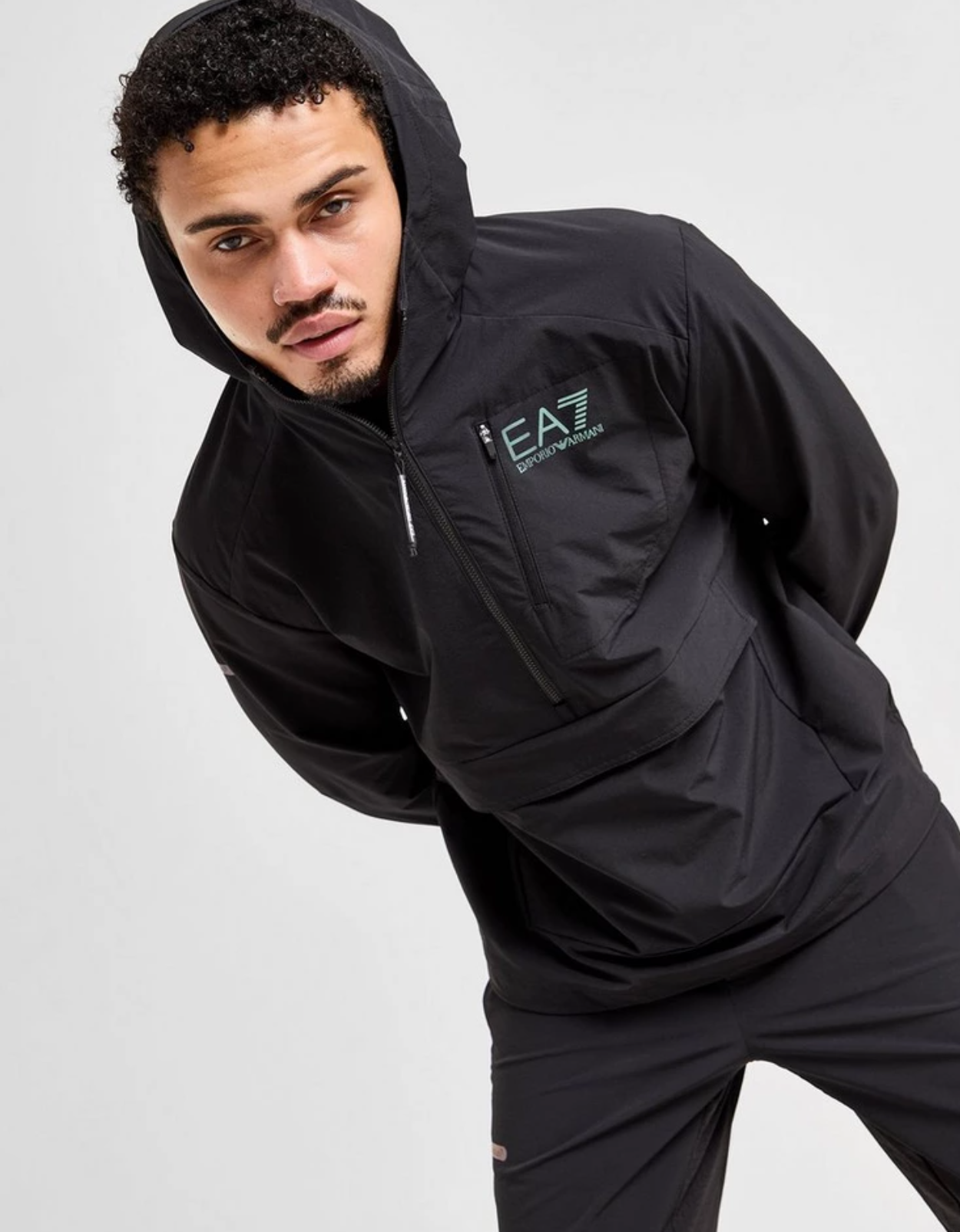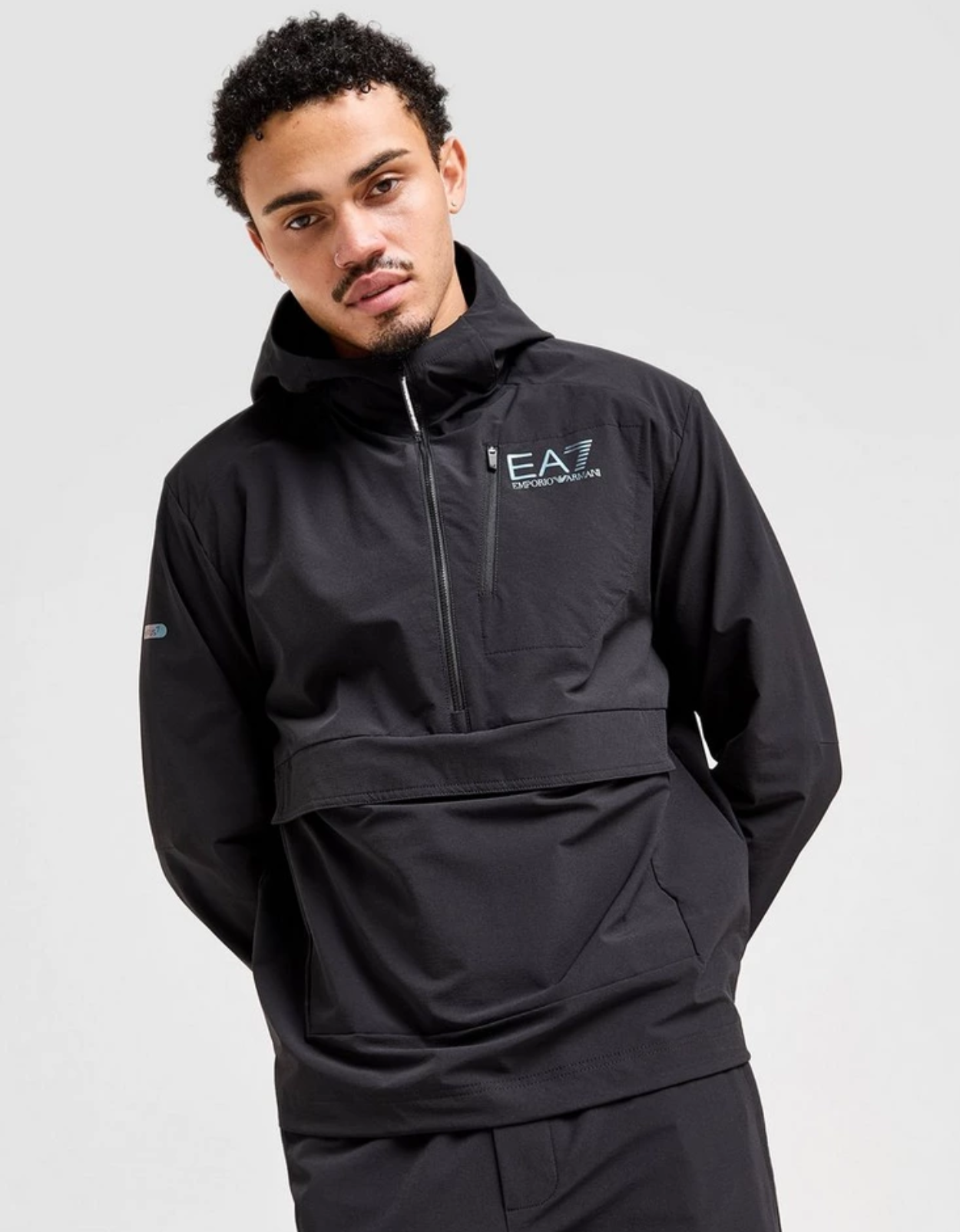 Add a premium layer to your look with this men's Ventus 1/2 Zip Jacket from Emporio Armani EA7. In a Black colourway, this overhead jacket is made from woven poly fabric that's light and durable. It features a half zip fastening and a fixed hood or extra coverage when you need it most. With a pouch pocket to the front and a zip to the chest for keep your essentials secure, this jacket is finished up with signature EA7 branding. | Our model is 6.1" with a 36.5" chest and wears a size medium.